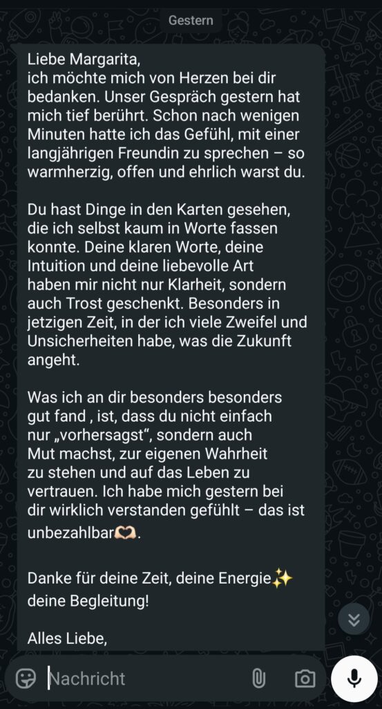 Manchmal stehen wir an Wendepunkten im Leben und wünschen uns mehr Klarheit über unsere nächsten Schritte. Eine Tarot-Lesung kann dir helfen, verborgene Zusammenhänge zu erkennen, neue Perspektiven zu gewinnen und dich wieder mit deiner inneren Stimme zu verbinden. Ich begleite dich dabei, die Antworten zu entdecken, die bereits in dir schlummern.